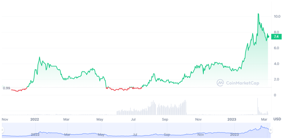 GNS là một trong số rất ít các token đã được thấy gần như tăng giá kể từ khi ra đời. Lịch sử giao dịch của GNS trở lại từ đầu năm 2022, khi nó bắt đầu giao dịch với mức giá khoảng 50 xu. Hiện tại, nó đang ngồi ở mức khoảng 7,5 đô la với ATH trên 10 đô la. Điều này chủ yếu có thể được quy cho việc token đã gần như bảo lưu giá trị qua quá trình tồn tại của nó, điều này cũng rõ ràng khi nhìn vào số lượng token đang lưu hành.