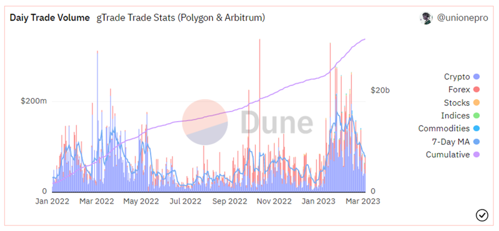 Daily trade volume on gTrade divided into asset classes. Source: dune.com