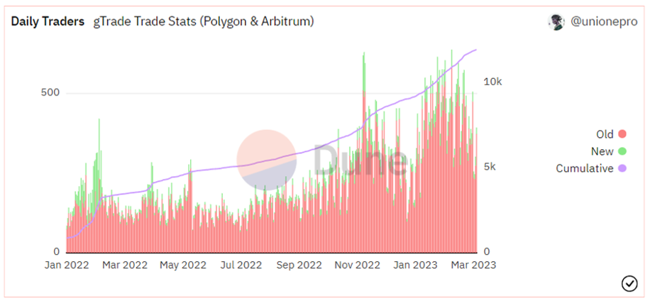 Đó có thể là một trong những lý do tại sao nhiều nhà giao dịch hiện nay đang chuyển sang giải pháp này. Điều này có thể thấy trên biểu đồ dưới đây, cho thấy số lượng nhà giao dịch cũ và mới cũng như số lượng tích lũy của họ, cho thấy sự tăng phổ biến của gTrade giữa nhóm người dùng này.