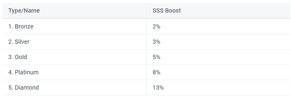 Tuy nhiên, việc sở hữu các NFTs trên nền tảng DeFi trading còn có nhiều lợi ích khác. Nắm giữ NFTs có thể giúp tăng cường phần thưởng Single Sided Staking (SSS). Tốc độ tăng cường lại khác nhau, với tốc độ tăng cường nhỏ nhất là 2% liên quan đến NFT Bạc và tốc độ tăng cường lớn nhất là 13% với NFT Kim cương.