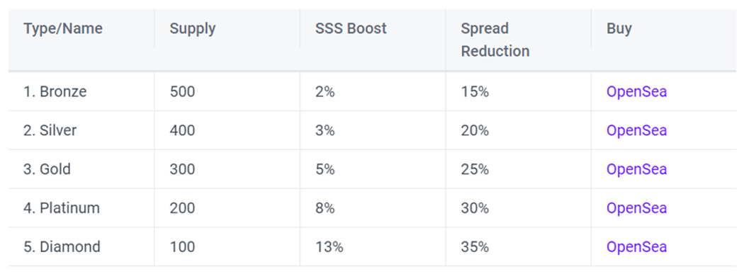 Nắm giữ NFTs có nhiều lợi ích, nhưng có thể nói lợi ích quan trọng nhất là giảm spread khi giao dịch. Đối với loại Bạc, điều này là -15%, nhưng với NFT Kim cương thì giảm xuống đến -35%. Điều duy nhất cần làm là nắm giữ NFT trong ví, được sử dụng để giao dịch.