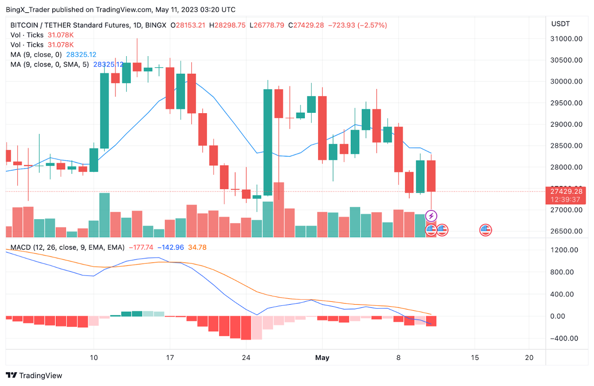 Biểu đồ nến hàng ngày của BTC cho thấy mức cao là $28.300 và mức thấp là $27.400. Xu hướng hiện tại có vẻ như đang kiểm định ngưỡng kháng cự $28.500. Tuy nhiên, đường trung bình động EMA15 đang hình thành một death cross, cho thấy tín hiệu giảm giá có thể xảy ra. Chỉ báo MACD cũng cho thấy khả năng xảy ra phân kỳ đỉnh, có thể hạn chế xu hướng tăng ở khoảng $27.000. Trong ngắn hạn, xu hướng vẫn chưa chắc chắn với việc giá đang cố gắng vượt qua ngưỡng kháng cự EMA30. Chỉ báo MACD cũng đang cho thấy sự phân kỳ đáy tiềm năng. Nhìn chung, thị trường hiện đang trong tình trạng thay đổi liên tục và không rõ nó sẽ đi theo hướng nào.