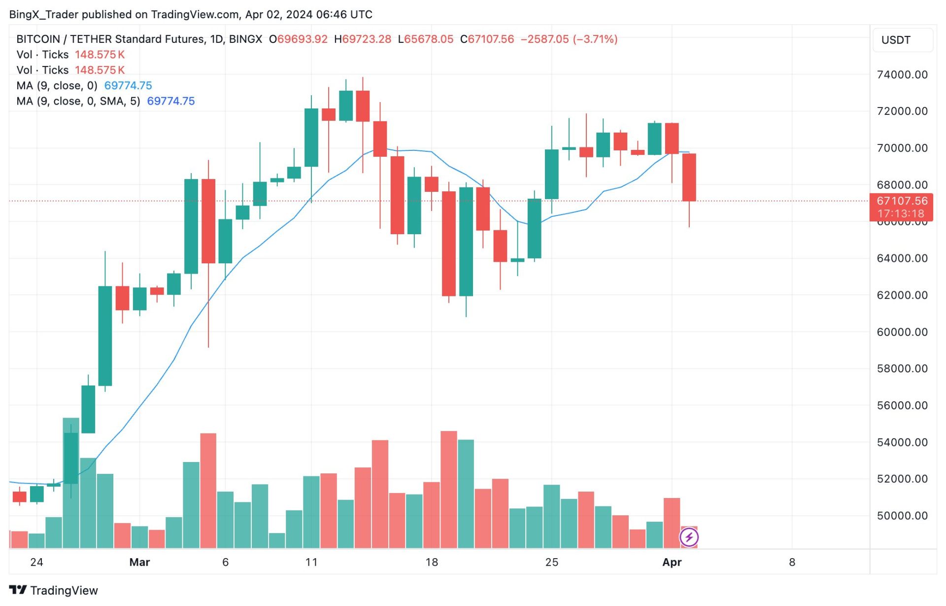 Giá Bitcoin đã cố gắng kiểm tra lại vùng hỗ trợ $66.000 vào ngày 1 tháng 4 khi thị trường Phố Wall mở cửa khiến giá giảm. Theo dữ liệu từ Cointelegraph Markets Pro và TradingView, giá BTC giảm hơn 4,5%, cho thấy khởi đầu quý 2 đáng lo ngại. Dòng tiền từ các tổ chức dường như không thể đẩy giá lên cao hơn – mặc dù không có dấu hiệu rút vốn từ Grayscale Bitcoin Trust (GBTC). Kỳ nghỉ lễ Phục Sinh có thể là một yếu tố ảnh hưởng. Grayscale không thông báo bất kỳ đợt bán ra đáng kể nào ngoại trừ một số $ETH và các coin khác. Phân tích sổ lệnh trên sàn giao dịch tiền điện tử lớn nhất thế giới, Material Indicators, dự báo tình hình ảm đạm cho giá BTC cho đến lần halving tiếp theo. Tuy nhiên, niềm tin về việc thiết lập đỉnh cao mới sau halving vẫn vững chắc. Mức hỗ trợ hiện tại là $65.500 và mức kháng cự là $70.500.