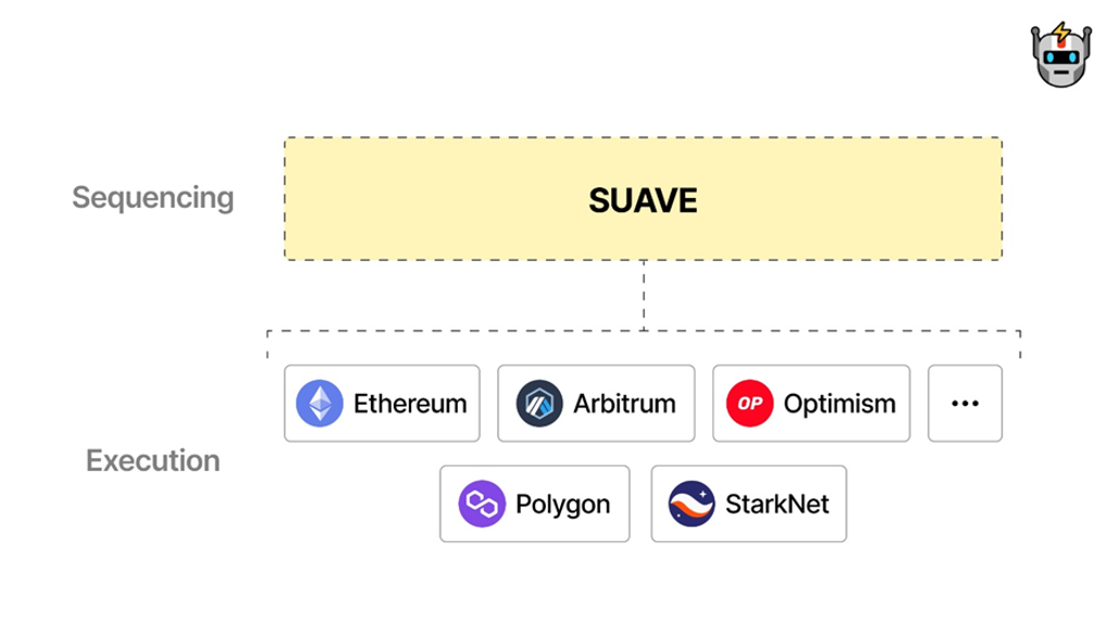 SUAVE là tên mã cho Single Unifying Auction for Value Expression (Đấu giá Đơn lập thể hiện Giá trị), được đề xuất bởi Flashbots. Kiến trúc mới này là một blockchain tương thích với EVM (Ethereum Virtual Machine) nhằm phục vụ như một bộ nhớ tạm chung và mạng xây dựng khối cho tất cả các blockchain. Nó cũng nhằm trở thành một lớp xếp hàng phân tán trên nhiều chuỗi.