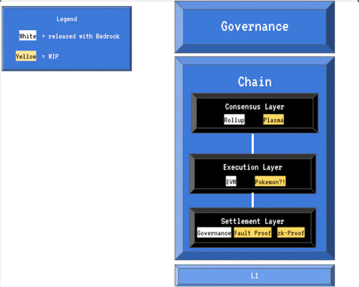 OP Stack đã được ra mắt vào tháng 10 năm ngoái và là một khuôn khổ (framework) phân tách các chức năng khác nhau của một blockchain và hội tụ chúng thông qua các giao diện lập trình ứng dụng (APIs). Bất kỳ mô-đun chức năng nào tuân theo các tiêu chuẩn OP Stack đều có thể được thêm vào một OP Chain như một mô-đun. Tính linh hoạt này giúp các nhà phát triển có thể nhanh chóng xây dựng một mạng lớp layer-2.