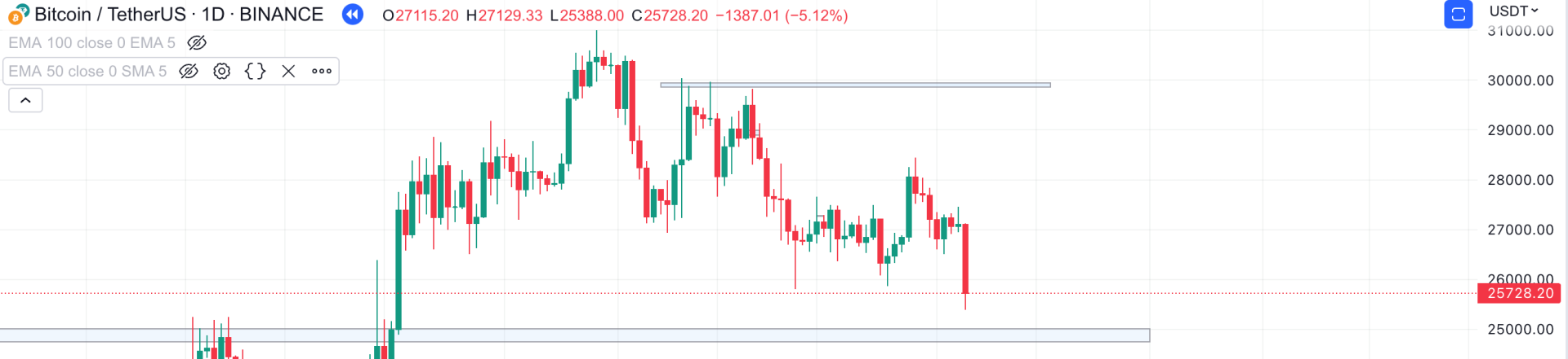 Bitcoin (BTC) cũng chịu cảnh ngộ tương tự khi bị bán tháo về mốc $25.471 trước khi phục hồi lên $25.728 ở mức giá đóng cửa. Đây là mức giá thấp nhất của Bitcoin kể từ giữa tháng 03/2023.