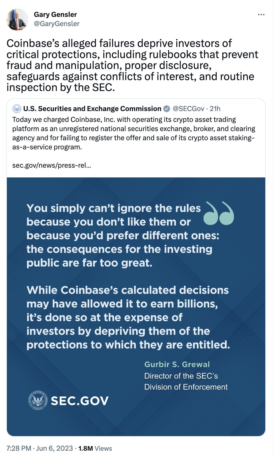 Vào ngày 06/06, Coinbase, một trong những sàn giao dịch tiền điện tử lớn nhất thế giới chính thức bị Ủy ban Chứng khoán và Giao dịch Hoa Kỳ (SEC) khởi kiện với các buộc sàn đã hoạt động như một sàn giao dịch chứng khoán, nhà môi giới và cơ quan thanh toán bù trừ quốc gia chưa đăng ký.