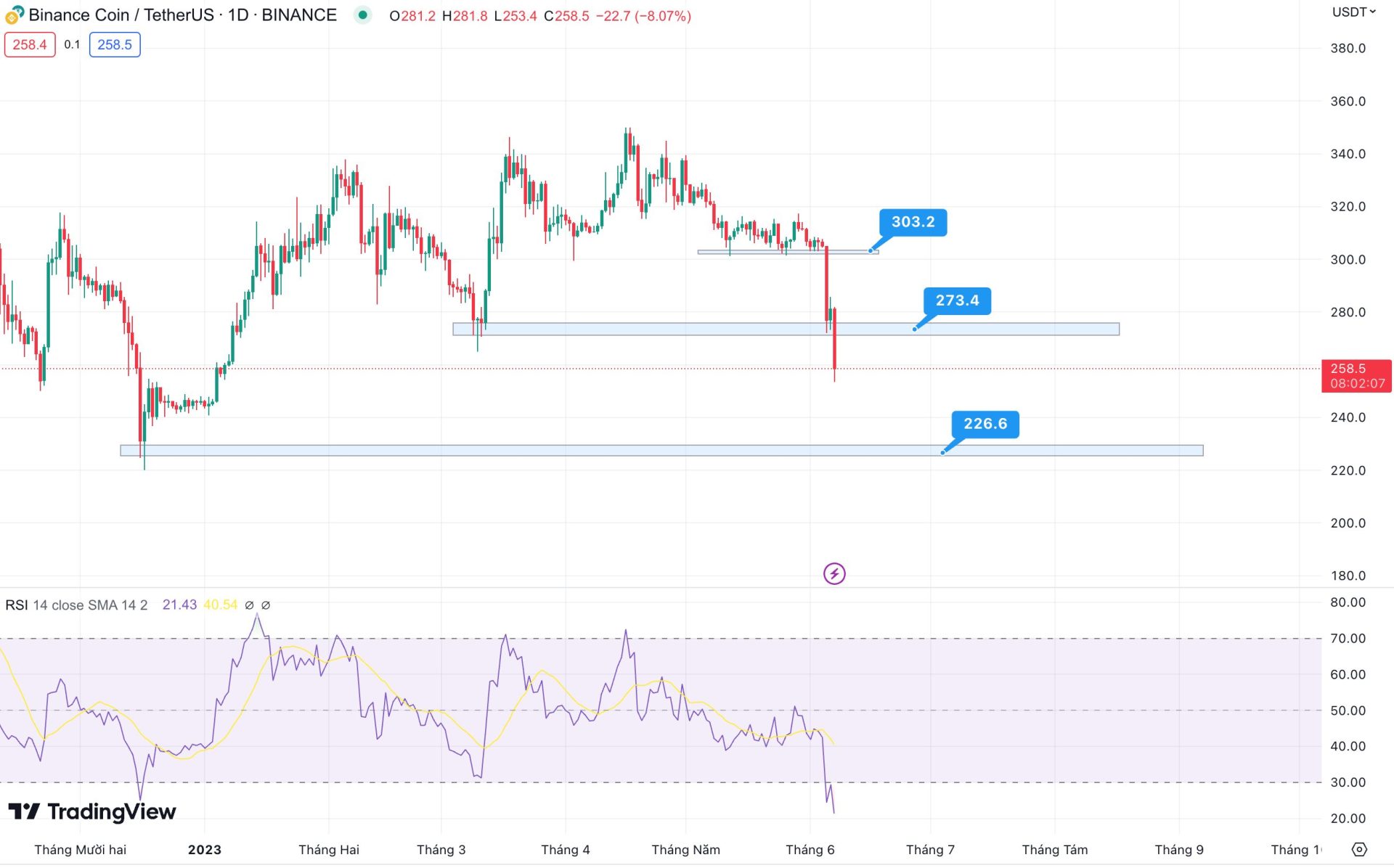 $BNB đã rơi xuống vùng hỗ trợ ở mức giá quanh khu vực $273 khi xuất hiện thông tin về vụ kiện của SEC và chững lại ở ngày tiếp theo. Tuy nhiên, ở thời điểm viết bài, nhiều thông tin rằng Toà án Hoa Kỳ đã chấp nhận việc phong toả tài sản của Binance US và các công ty con đã khiến giá BNB tiếp tục rơi xuống vùng $258 (tương đương với mức giảm 8.11%).