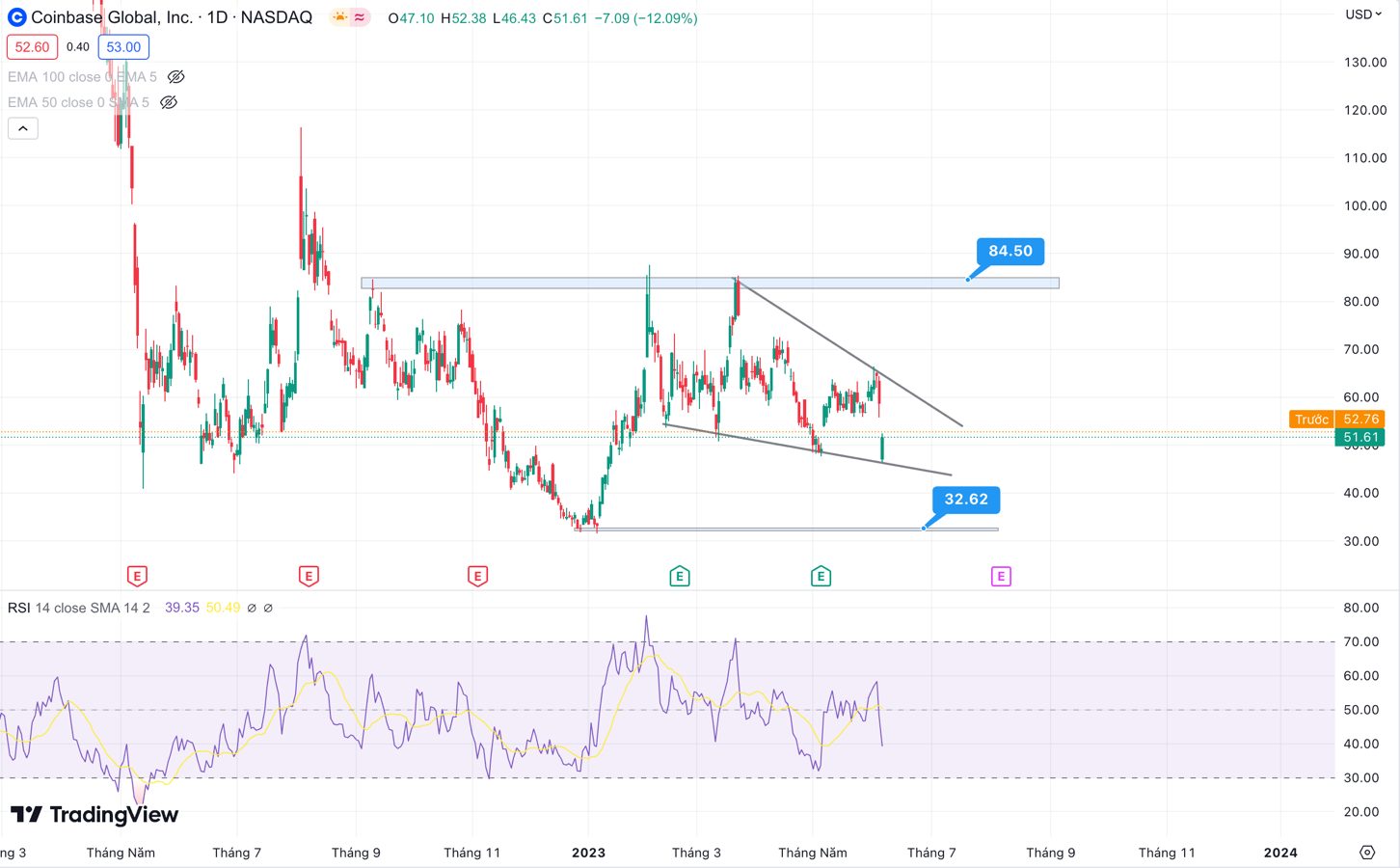 Từ góc nhìn phân tích kỹ thuật, COIN đã chạm đáy ở mức $31.7 vào cuối tháng 12/2022 và tăng lên mức $87.11 hơn 1 tháng sau đó. Hiện tại, cổ phiếu này đang di chuyển trong mô hình nêm giảm và giá đang phản ứng với cạnh dưới của nêm. RSI cũng đang đưa các dấu hiệu trung tính, chưa có xu hướng rõ ràng.