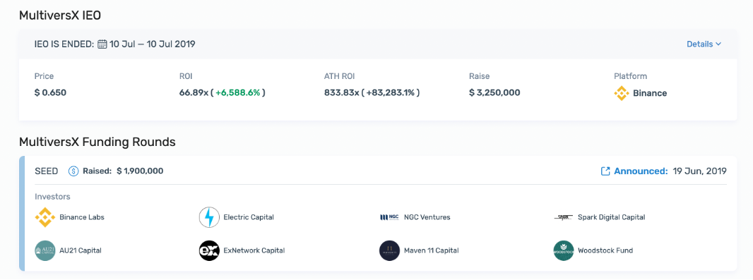 MultiversX đã IEO trên Binance Launchpad vào tháng 07/2019 với số vốn raise được hơn 3 triệu đô la cho 5 triệu token được public sale.