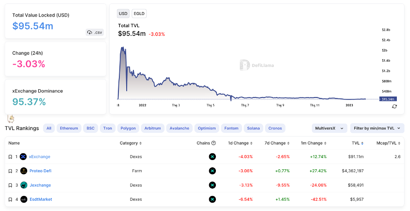 Mảng DeFi của Multivers còn ít dự án được xây dựng native trên hệ sinh thái này, nổi bật nhất là xExchange (trước đây là Maiar) với $91.11M TVL và chiếm tới 95.37% dominance. Đây cũng là một điểm đáng ngại khi một dự án chiếm dominance quá cao trong một hệ sinh thái, sự sụp đổ bất kỳ lúc nào của dự án bởi các cuộc tấn công hay bất kỳ nguyên nhân nào khác có thể khiến hệ sinh thái đi vào khủng hoảng, thậm chí ngừng hoạt động.