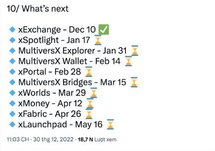 Tuy nhiên đây mới chỉ là roadmap cho 2023, các sản phẩm vẫn đang trong quá trình nghiên cứu và phát triển. Có thể thấy để đạt được mục tiêu như trên, Multivers sẽ cần khá nhiều thời gian để hoàn thiện sản phẩm của mình. Nguồn: https://twitter.com/MultiversX/status/1608856235545366530