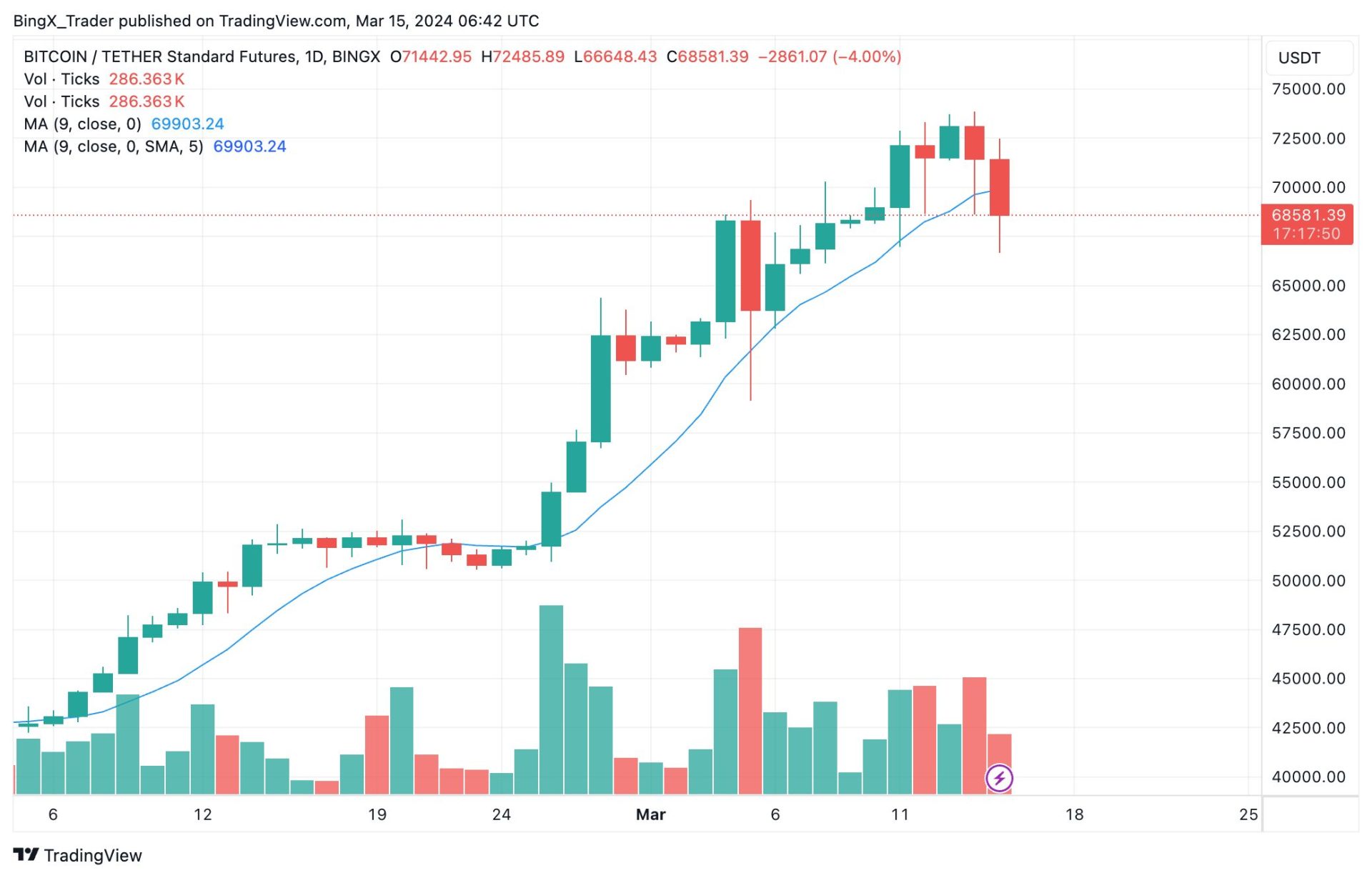 Mặc dù Ủy ban Thị trường mở Liên bang (FOMC) không dự kiến giảm lãi suất trong cuộc họp sắp tới vào ngày 20/3, nhưng nhà đầu tư ngắn hạn vẫn cần chú ý đến xu hướng hiện tại. Sự tăng trưởng liên tục đã kéo dài trong nhiều tháng và có thể sẽ đối mặt với sự điều chỉnh. Bước tiếp theo là quan sát dòng vốn ETF sau khi thị trường chứng khoán Mỹ mở cửa để xác định rõ hơn mức độ và thời gian điều chỉnh. Vùng hỗ trợ được xác định là 66.000 USD và kháng cự là 70.000 USD.