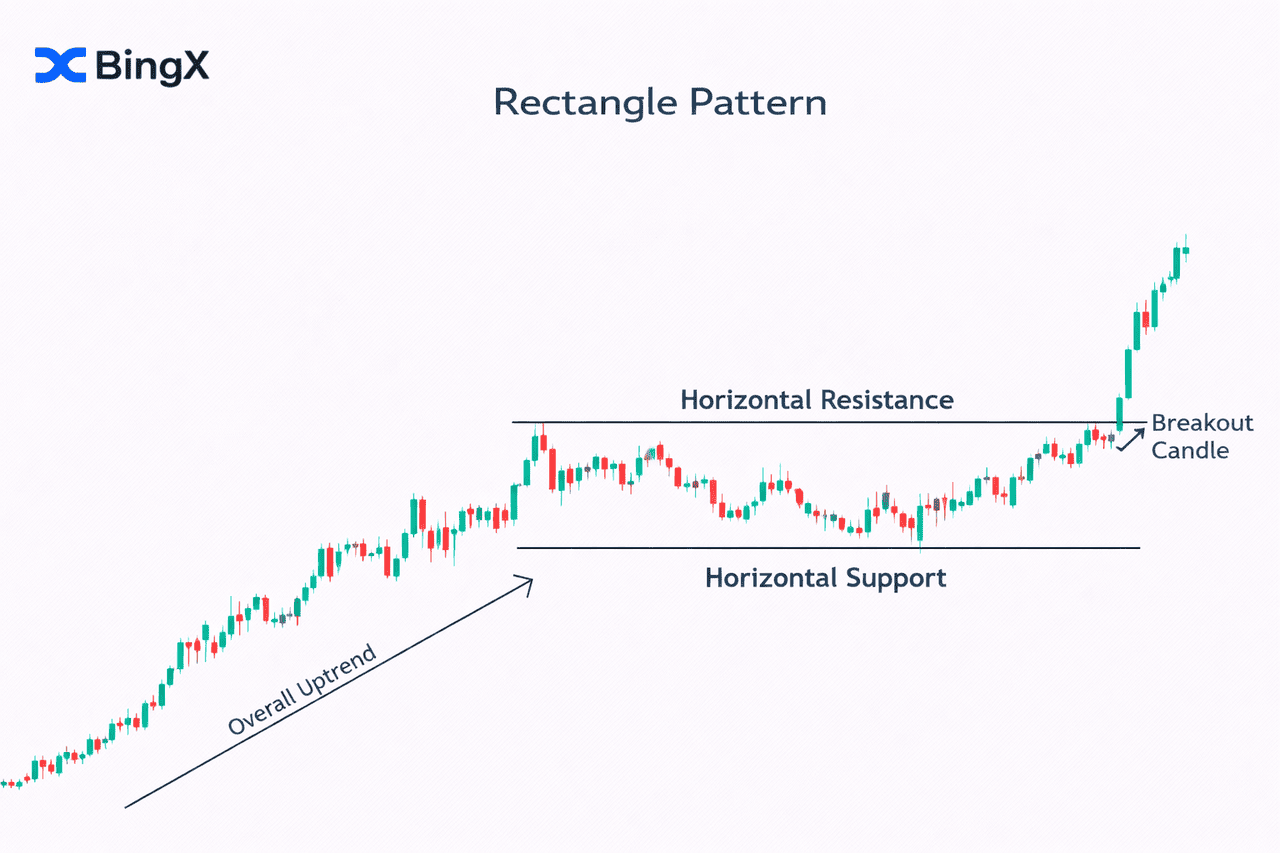 • Trend-Kontext: In einer umfassenden Trading-Strategie wird ein Rechteck als bullisches Fortsetzungsmuster betrachtet, wenn es während eines allgemeinen Aufwärtstrends auftritt.