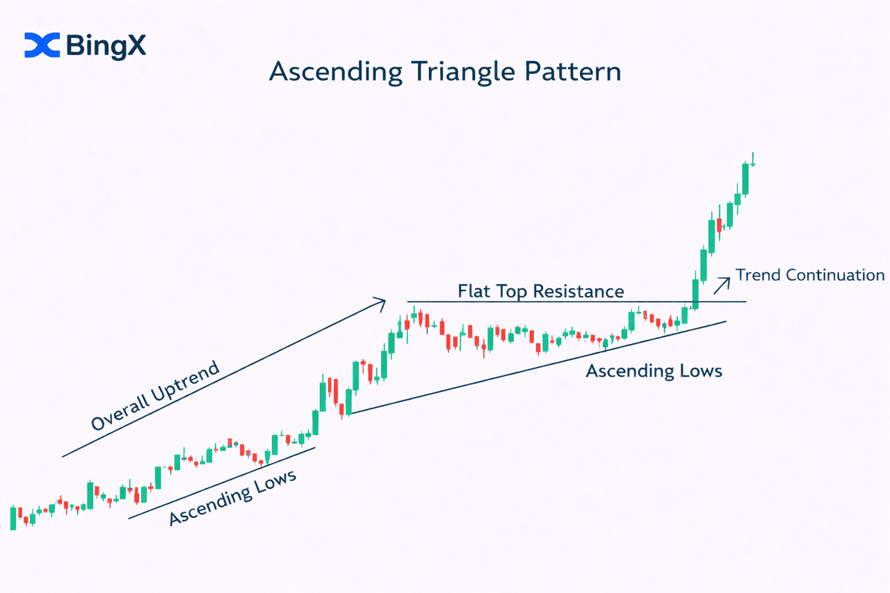 aufsteigende Dreieck bildet sich typischerweise während eines Aufwärtstrends. Es ist definiert durch eine flache Resistenzlinie oben und eine Serie aufsteigender Tiefs, die eine aufwärts geneigte Support-Linie bilden. Diese Struktur signalisiert, dass Käufer zunehmend aggressiver werden und den Preis jedes Mal schneller zurück zur horizontalen Resistenzlinie drücken.