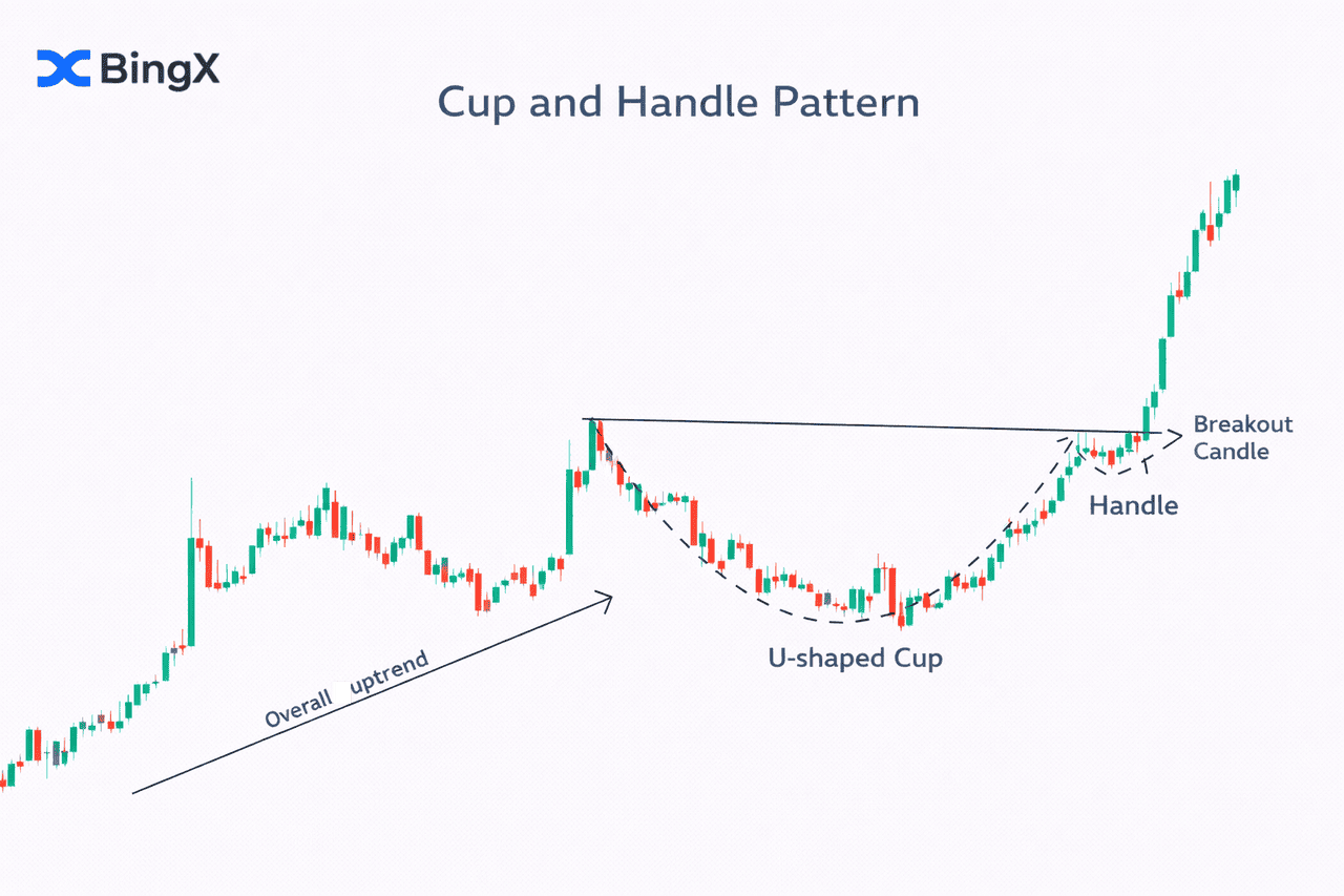 Cup-and-Handle-Muster ist ein hoch angesehenes bullisches Fortsetzungsmuster, das signalisiert, dass der Markt seine Konsolidierung abgeschlossen hat und bereit ist, seine Aufwärtsbewegung fortzusetzen. Diese Formation wird in Krypto-Chart-Mustern bevorzugt, da sie den Übergang von einer Periode der Gleichgültigkeit zu einer Periode steigender Nachfrage klar visualisiert.
