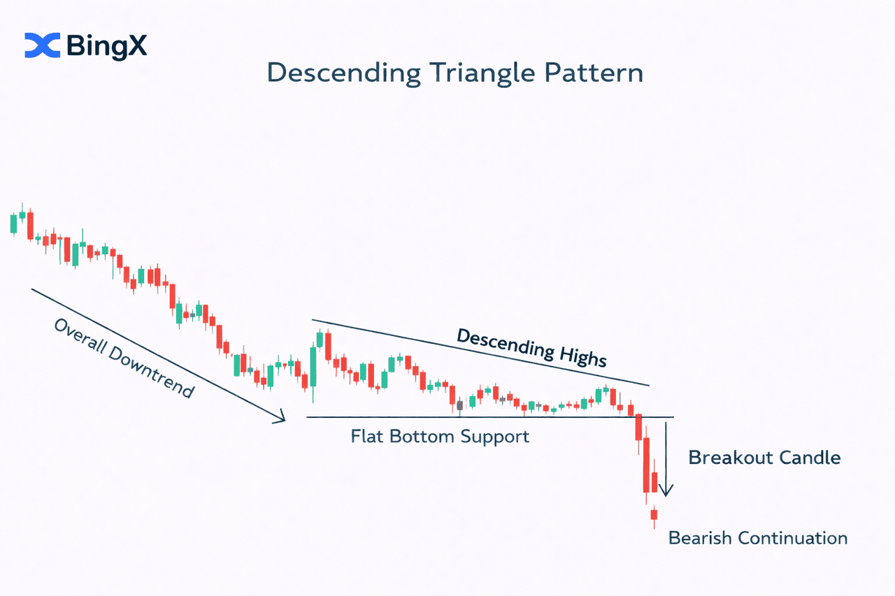 absteigende Dreiecksmuster während eines Abwärtstrends. Diese bärischen Fortsetzungsmuster weisen eine horizontale Support-Linie und eine abwärts geneigte Resistenzlinie auf. Dies zeigt an, dass sich der Verkaufsdruck aufbaut, da Verkäufer ihre Angebotspreise senken und schließlich zu einem Durchbruch unter den Support-Boden führen.