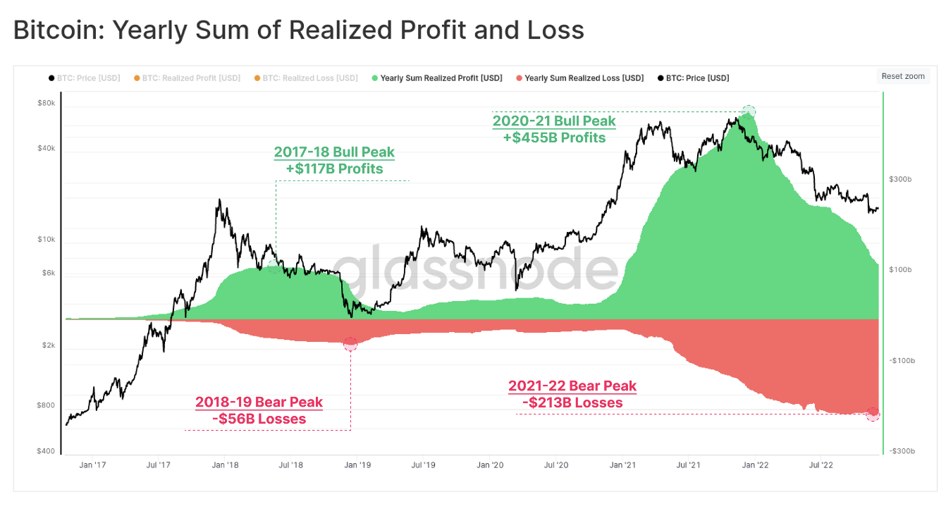 Bong bóng thanh khoản dư thừa từ chính sách tiền tệ lỏng lẻo giai đoạn 2020-2021 đã tạo ra lợi nhuận thực kỷ lục. Hơn 455 tỷ đô lợi nhuận hàng năm đã được các nhà đầu tư Bitcoin di chuyển trên thị trường, với mức cao nhất đạt được ngay sau ATH tháng 11 năm 2021.