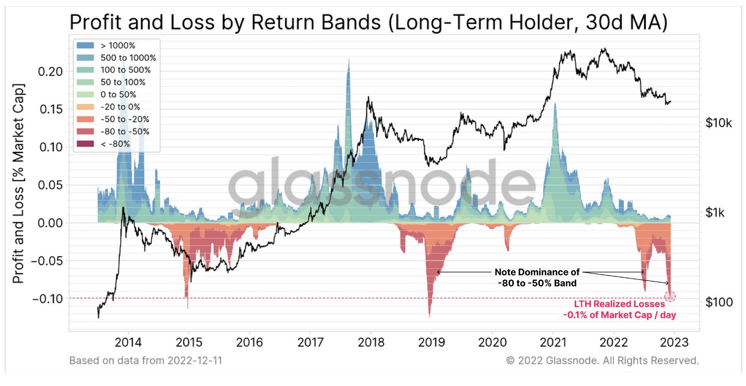 Đáng chú ý là sự đóng góp của các holder dài hạn (LTH), những người đã thực hiện hai trong số các đợt chốt lỗ lớn nhất lịch sử. Trong suốt tháng 11, mức lỗ của LTH đạt đỉnh -0.1% vốn hóa thị trường mỗi ngày và chỉ có thể so sánh về quy mô với mức đáy của chu kỳ 2015 và 2018. Đợt bán tháo vào tháng 6 cũng gây ấn tượng tương tự ở mức -0.09% vốn hóa thị trường mỗi ngày, với sự thống trị của LTH khi chốt lỗ từ 50% đến 80%.