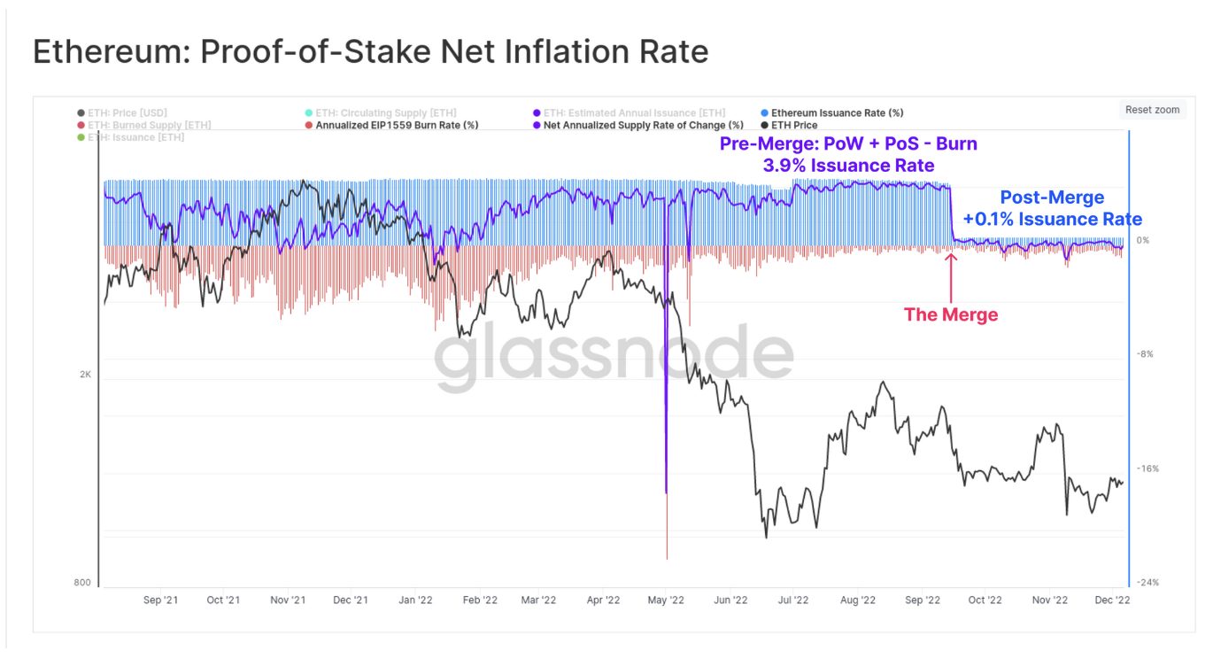 Cùng với việc chuyển đổi sang Proof-of-Stake, chính sách tiền tệ của Ethereum đã được điều chỉnh với lượng phát hành thêm thấp hơn đáng kể. Tỷ lệ phát hành danh nghĩa (màu xanh) là khoảng 0.5%, tuy nhiên sau áp dụng đề xuất EIP1559 (màu đỏ), tỷ lệ này gần như được bù đắp hoàn toàn và rơi vào khoảng 0.1%. So sánh với tỷ lệ lạm phát ròng là 3.9% trước the Merge cho thấy mức độ thay đổi đối với việc phát hành đã diễn ra mạnh mẽ như thế nào.