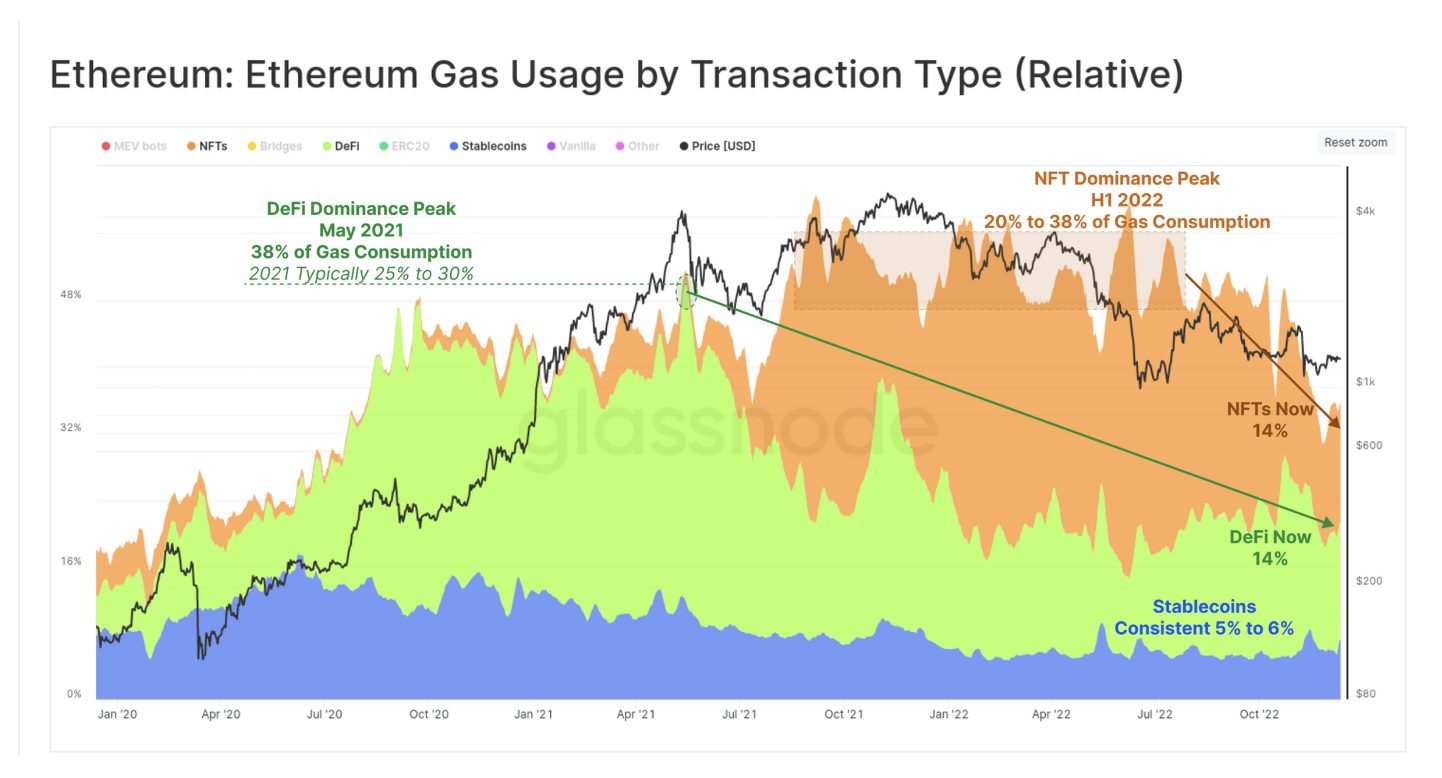 Trong một chu kỳ bùng nổ tương tự, các giao dịch liên quan đến NFT chiếm 20% đến 38% lượng gas sử dụng cho đến nửa đầu năm 2022, nhưng hiện cũng đã giảm xuống còn 14%. Stablecoin đã giữ mức thống trị ổn định từ 5% đến 6% trong suốt năm nay.
