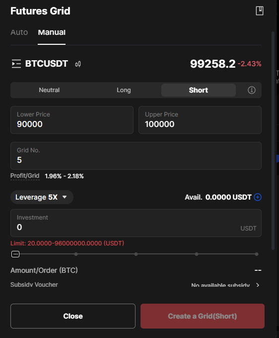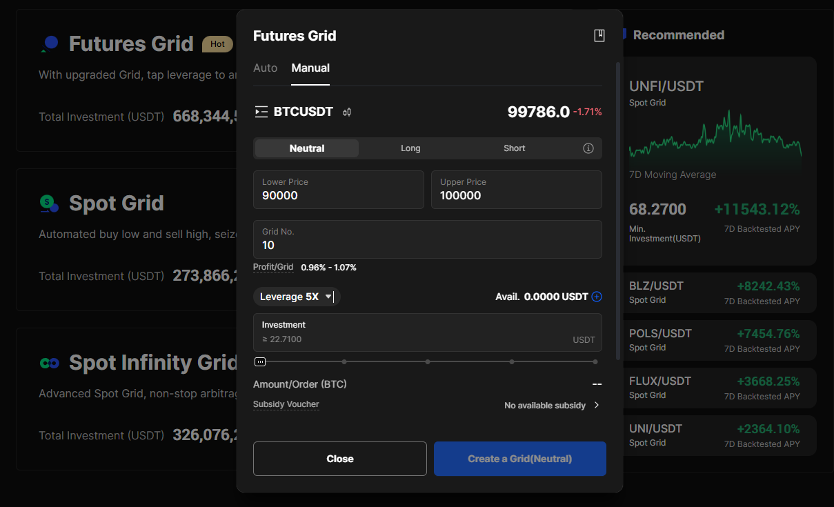 BTC stabil di sekitar $90.000–$92.000 dan mulai bergerak sideways. Sambil menunggu pemulihan, Anda mengaktifkan bot grid dalam rentang saat ini untuk menghasilkan pendapatan gaya premium dari osilasi.