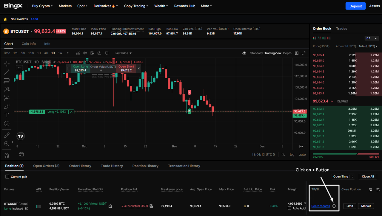 Opsi A - Take-Profit Tetap: Anda memiliki order jual limit yang ditempatkan pada $102.000. Ketika BTC mencapai level tersebut, seluruh posisi Anda ditutup secara otomatis.