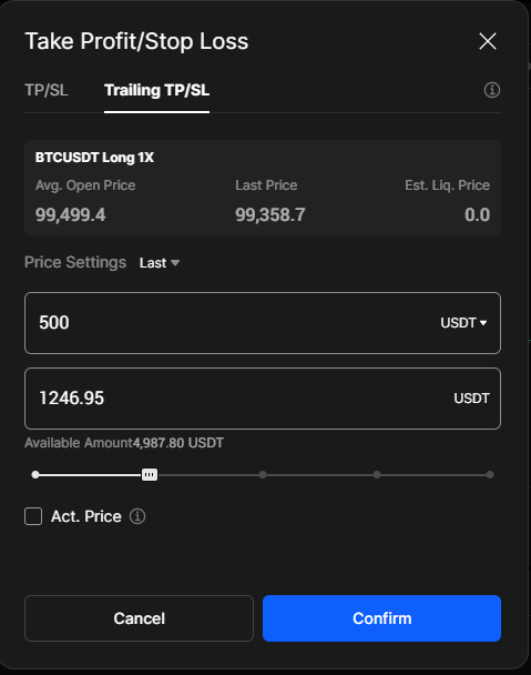 Opsi B - Trailing Take-Profit: Alih-alih keluar tetap, Anda mengaktifkan trailing take-profit dengan jarak trailing $500 setelah BTC melewati $98.000.