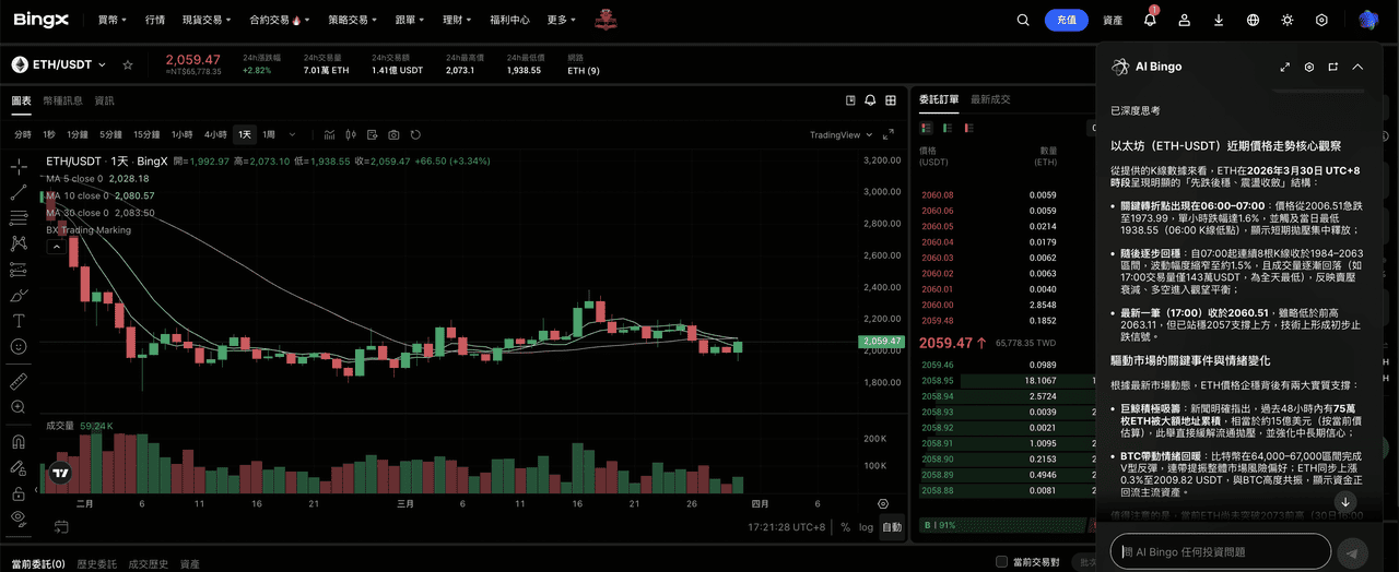 台湾ユーザーにとって、BingXは「価格追跡」と「リアルタイム取引」を最も直接的に統合したデスクトップツールです。プラットフォームは完全な繁体中文インターフェースを提供し、アカウント設定、相場ページからカスタマーサポートまで、全過程で翻訳ツールに依存する必要がありません。ETH/USDT現物と無期限先物のリアルタイム価格、デプスチャート、約定記録が同一ページに集中しており、ユーザーが価格を追跡しながら直接注文できるため、異なるツール間の切り替えが不要で、操作遅延によるリスクを軽減します。
