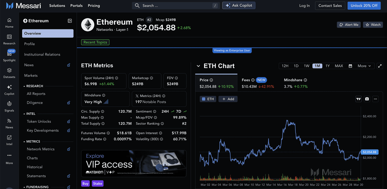 Messariは機関級暗号資産研究プラットフォームとして位置づけられ、ETH価格追跡ツールの中では上級オプションに属します。一般的なツールが価格と約定データのみを提供するのと比較して、Messariはオンチェーンファンダメンタルズと長期トレンド分析により重点を置いており、例えばアクティブアドレス数、取引件数、ネットワーク手数料収入、ステーキング比率などの指標で、ユーザーがネットワーク使用状況から価格変動背後の構造的要因を理解できます。これによりMessariは「研究ツール」により近く、リアルタイム相場ツールではありませんが、Messariは現在英語版インターフェースのみを提供しており、繁体中文ユーザーにとっては参入門戸が比較的大きいです。