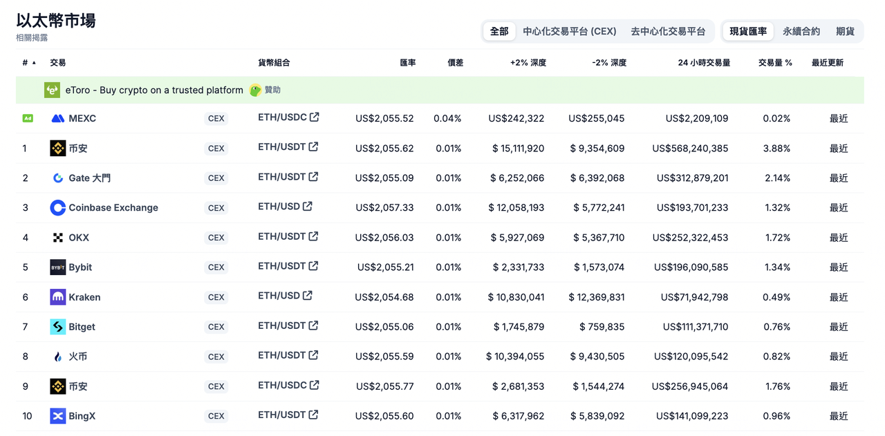 CoinGeckoは、ETH通貨ページの「マーケット(Markets)」タブで、世界数百の取引所のETH/USDとETH/USDTリアルタイム価格を統合し、24時間取引量、売買価格差(+2%深度)、最終更新時間を同期表示します。これにより、ユーザーは単一ページで異なるプラットフォーム間の価格差を直接比較でき、例えばBingX、Kraken、Coinbaseなどの主要取引所を迅速に比較し、現在の流動性が良好で価格差が小さい市場を見つけてから取引を行うことができます。注意すべき点は、CoinGeckoの価格は各取引所約定価格の加重平均であり、更新頻度は約1〜2分で、交換前の決定参考に適していますが、秒レベルやミリ秒レベルの高頻度取引判断には依存するべきではありません。