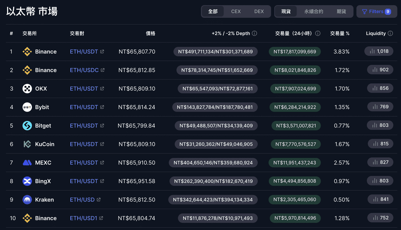 CoinMarketCapも通貨ページで「マーケット(Markets)」タブを提供し、各大手取引所のETHリアルタイム価格と取引量情報をリストアップしており、機能はCoinGeckoと似ていますが、情報表示では一般投資家の使用習慣により偏っています。重要な特徴の一つは「流動性スコア(Liquidity Score)」を提供することで、各取引所価格の信頼性を評価し、どの市場がより高い実際の取引深度を持つかをユーザーが識別し、偽の取引量や低流動性市場に誤導されるリスクを軽減するのに役立ちます。多くのユーザーにとって、CoinMarketCapはCoinGeckoの補完ツールとして、価格と市場品質の相互検証に使用できます。