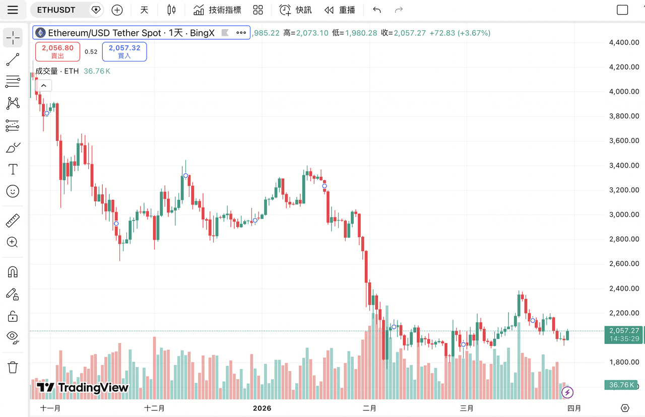 TradingViewは現在最も主流なデスクトップ版チャートと価格追跡ツールの一つで、特にETHのテクニカル分析と価格観察に適しています。プラットフォームはETH/USDとETH/USDTをサポートし、Coinbase、Krakenなど複数の取引所データソースに接続でき、ユーザーは実際の取引プラットフォームに応じて対応する価格を選択し、チャート分析と約定価格の偏差を避けることができます。取引所内蔵チャートと比較して、TradingViewはより完全なテクニカル指標、描画ツール、マルチタイムフレーム分析を提供し、価格を単純な受動表示ではなく、トレンドとエントリー・エグジットタイミングを判断するために使用できます。