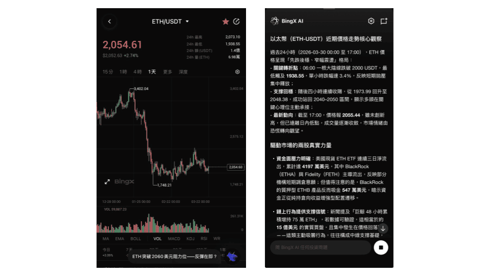 BingXのモバイルアプリ(iOS / Android)は、デスクトップ版の完全機能と繁体中文インターフェースを継続し、モバイル環境でETH価格を追跡し取引を実行する最も直接的なツールです。ユーザーはアプリ内でETH/USDTリアルタイム価格、ローソク足チャート、デプスチャート、約定記録を確認でき、すべての核心相場情報が同一インターフェースに集中しており、異なるツール間の切り替えが不要です。