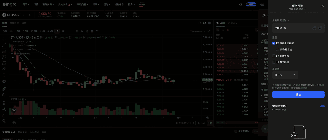 BingXは「ETH価格追跡、テクニカル分析、取引操作」を同時に統合できる数少ないツールの一つで、ユーザーは同一インターフェースで相場観察から実際の注文まで完全なフローを完了できます。台湾ユーザーにとって、繁体中文インターフェースは操作門戸を下げ、価格追跡とアラート設定をより直感的にします。デスクトップ版でもモバイルアプリでも、設定方法は基本的に一致しており、日常的なETH/USDT価格変動の継続監視に適しています。