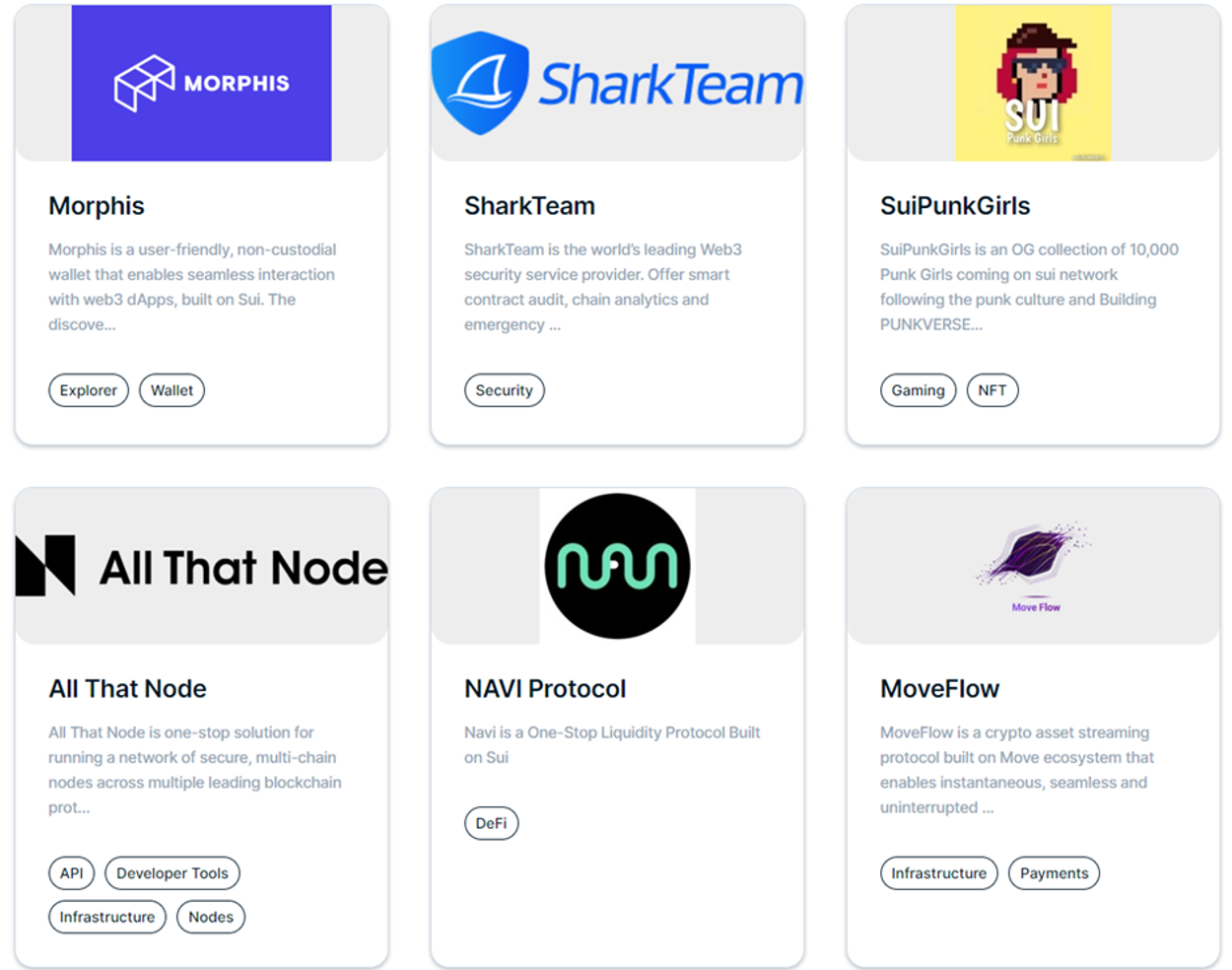 其中包括來自不同領域的專案,如安全、隱私、遊戲、NFT、DeFi、AMM、托管、治理、貸款等。以下列表只包含來自各個領域的10個不同專案,以展示Sui生態系統提供的各種可能性。