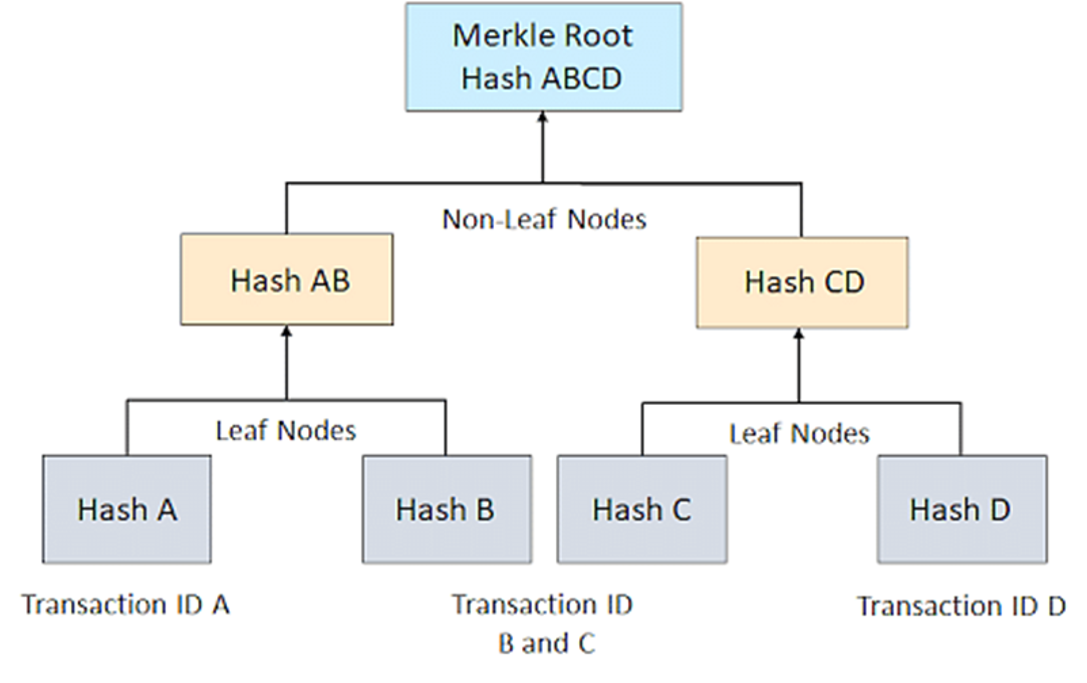・葉節點:由交易數據的哈希值組成。 每個交易都對其數據進行哈希處理,從而創建交易 ID,然後將其存儲在葉節點中。
