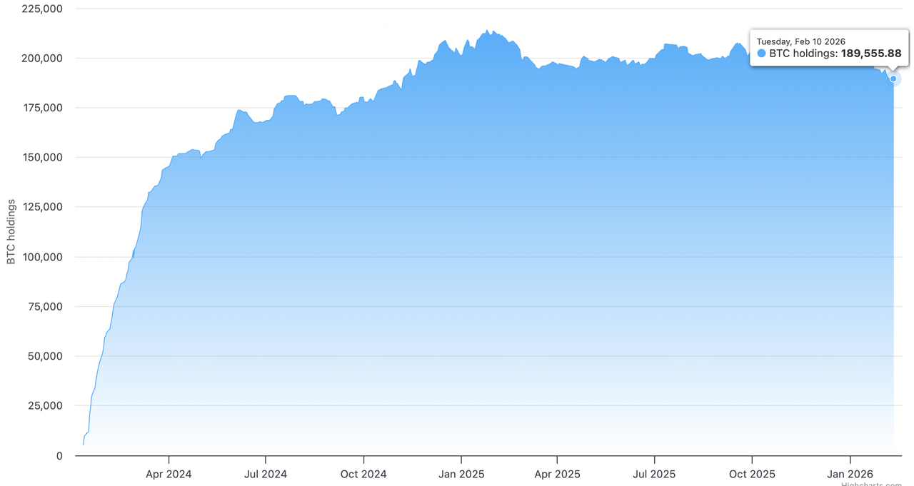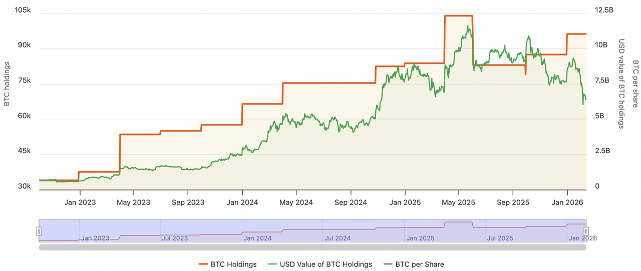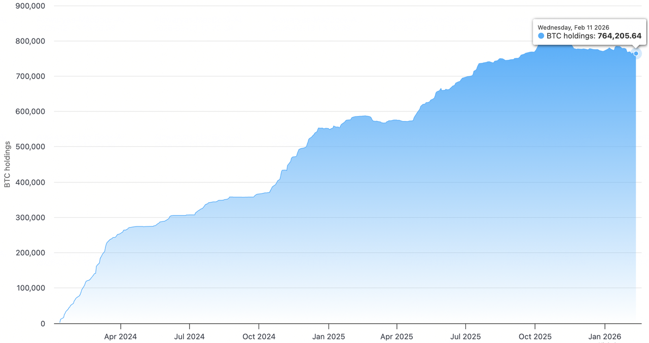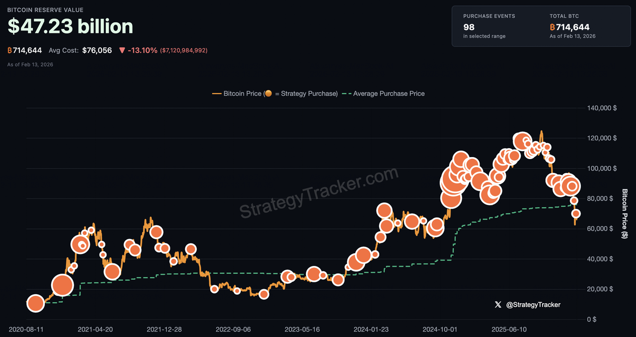 在執行主席Michael Saylor的領導下,Strategy Inc. (MSTR)已從軟體供應商轉型為世界首家比特幣國庫公司,現控制714,644枚BTC,約佔總供應量的3.4%。截至2026年2月13日,該公司持有量價值473.3億美元,相對於平均成本每枚76,056美元、總購買價543.5億美元,帳面未實現虧損約70.3億美元。儘管2月6日深度折價事件中股票市值跌至其淨資產價值以下至0.85倍mNAV,Strategy堅持其高信念橙點策略,2月9日以9000萬美元收購1,142枚BTC。公司保持財務韌性,維持22.5億美元現金,足以覆蓋30個月的股息和債務義務,同時將其STRC優先股定位為新的數位信貸層,以資助永續積累而不強制清算。