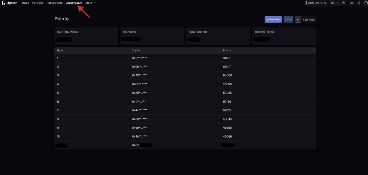 直接在 Lighter 平台的排行榜部分監控您的排名和進度,其中即時排名反映了用戶活動。儘管團隊尚未披露確切的積分累積公式,但社區回饋表明,最高的獎勵來自於對清算的貢獻和產生大量的交易量。每週,總計 25 萬積分會分發給參與者,以激勵持續參與。此外,一旦您累積至少 100 積分,您就可以解鎖邀請新用戶並透過推薦賺取更多獎勵的能力。目前,空投沒有官方領取頁面。